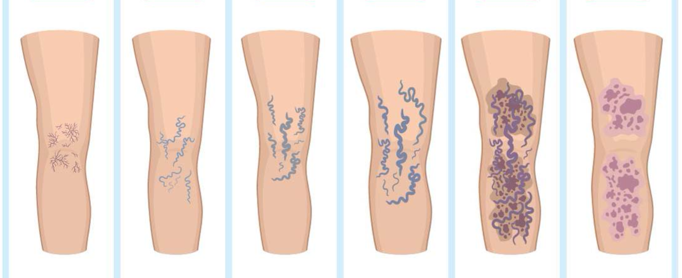 ・網状静脈瘤:中程度の太さの静脈が網目状に広がり、比較的皮膚に近い部分で見られる